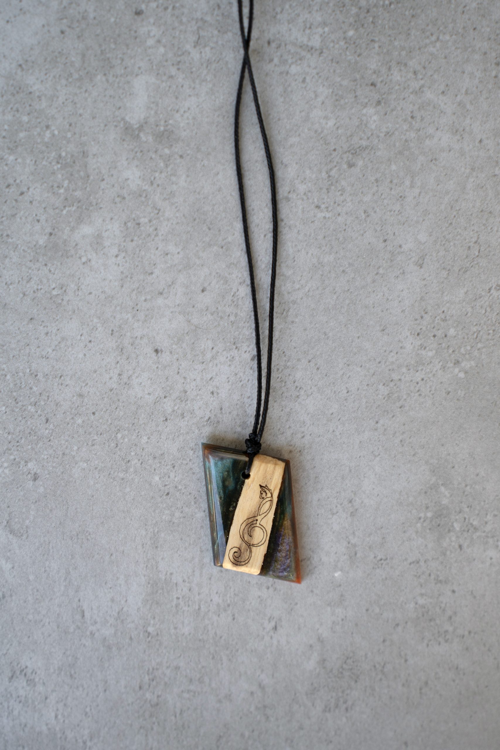 A handcrafted wood & resin necklace featuring our signature scent, built-in engravings, and a durable military-grade cord. One-of-a-kind craftsmanship.